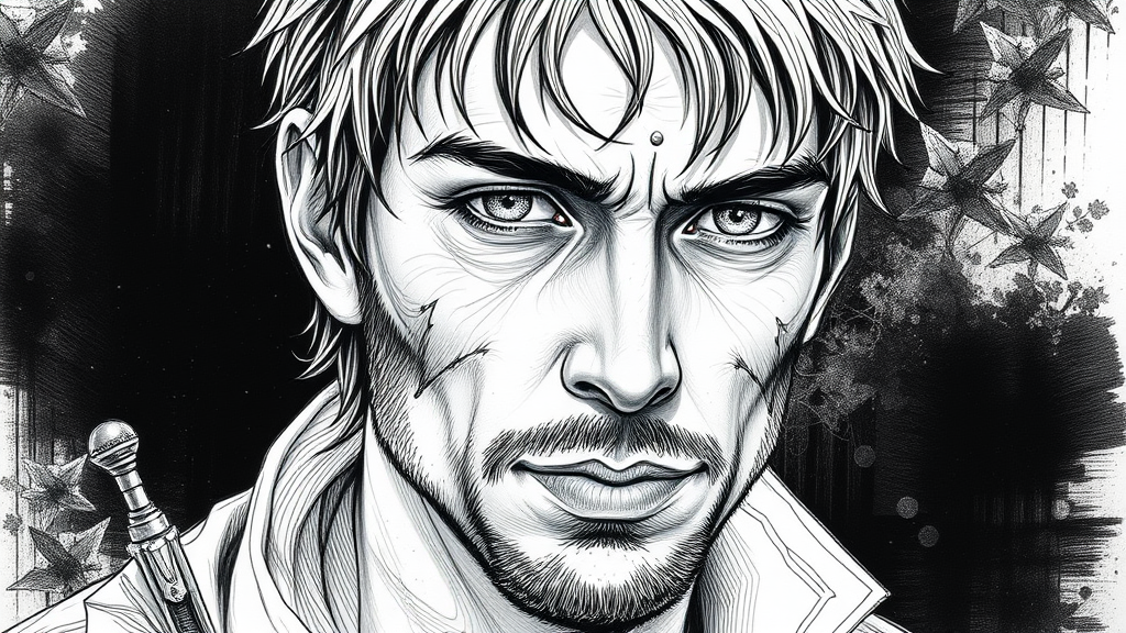 Gerard Way portrait in pen and ink, featuring intricate line work, inspired by the styles of Craig Mullins, Ruan Jia, Kentaro Miura, Greg Rutkowski, and Loundraw, with elements influenced by the aesthetic of "Dishonored," rendered in high quality through Octane for an 8K resolution, maintaining a square aspect ratio. The portrayal should incorporate subtle creative twists, such as ethereal lighting or a mysterious background, while preserving the essence of the original concept.