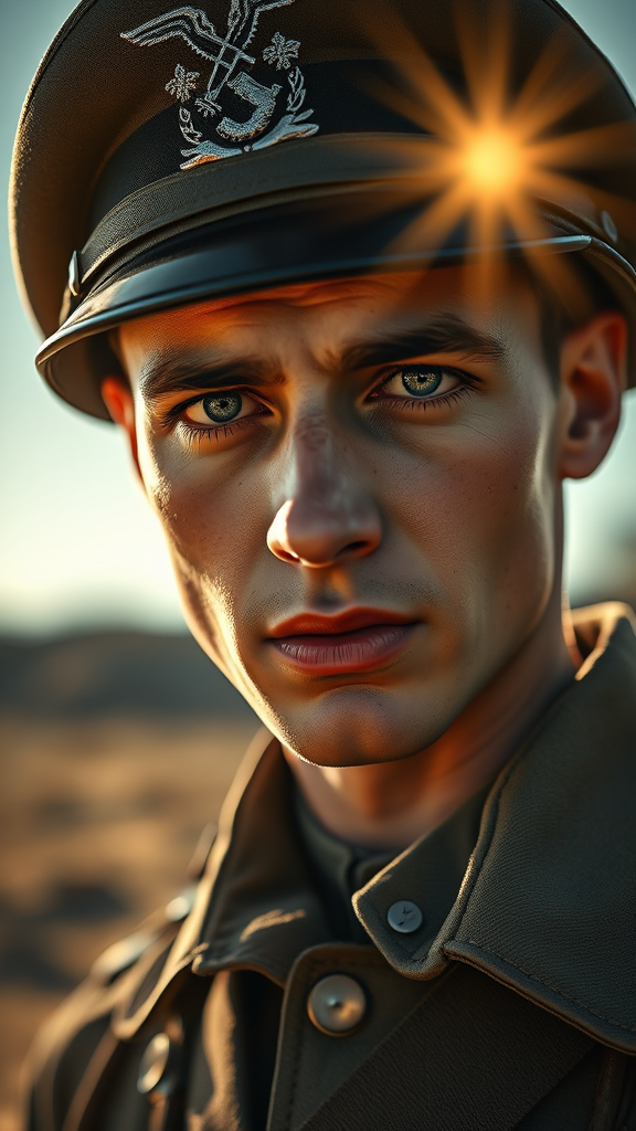 German soldier in World War II attire, standing under the sun, capturing the essence of perfect human eyes and pupils, male figure with intricate detailing reminiscent of Joaquin Sorolla's artwork, bathed in soft natural light with a cinematic glow, 85mm perspective highlighting sunshine across his face, reflecting stunning lumen effects, photographed in a breathtaking environment, embodying Hyperrealism through advanced CGI techniques, meticulously crafted using octane render and raytracing for remarkable detail and depth.