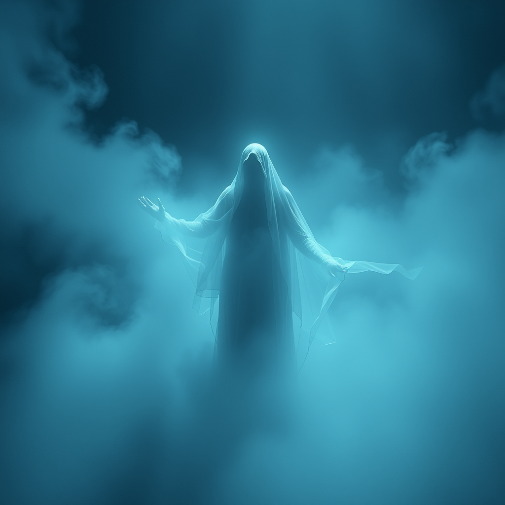 Ghostly figure in the mist, Realistic yet dreamlike, Eerily beautiful with enchanting lighting, Delicate wisps drifting, Ethereal essence, Incredibly detailed, Artstation-worthy, Crisp clarity, Vivid hues blending harmoniously.