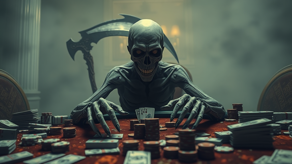 Ghoulish figure playing poker, scythe ominously positioned in the background, eyes fixed on the viewer, cluttered poker table scattered with chips, cards, and stacks of cash, eerie atmosphere, unsettling CGI, 3D, low-res elements, distorted text, visible errors, cropped visuals, poor quality resembling a low-quality jpeg image, unattractive and duplicated motifs, with morbid undertones, showing oddly shaped or missing limbs, multiple appendages, rough sketches of hands and face, features appearing mutated and disfigured, resulting in an unsettling blurry effect, overly elongated neck, distorted anatomy and proportions, additional or fused fingers, uncanny expressions, and inadvertent artifacts such as unexpected signatures or watermarks.