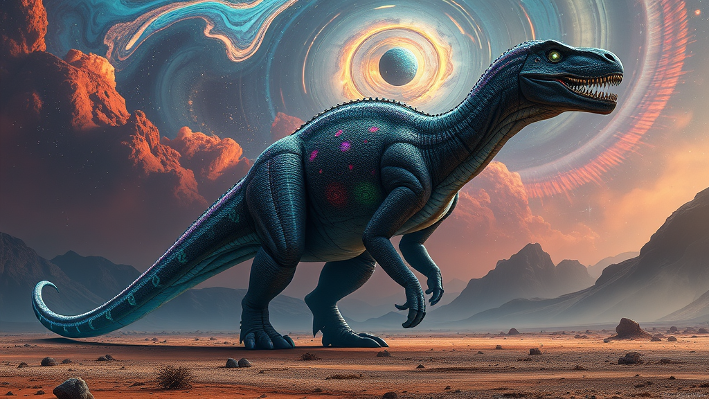 Giant extraterrestrial dinosaur with iridescent scales and bioluminescent patterns against a backdrop of a barren alien landscape, towering above with elongated limbs and a shimmering tail, eyes glowing with an otherworldly intensity, under a swirling, colorful nebula sky.