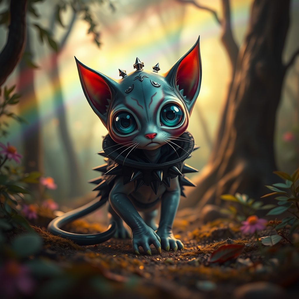 Giant-eyed alien squid kitten adorned in a dark spiked garment slinking through a vibrant forest, vivid rainbow illumination, art nouveau style, cinematic matte painting quality, animated lighting effects, depth of field emphasis, intricately detailed.