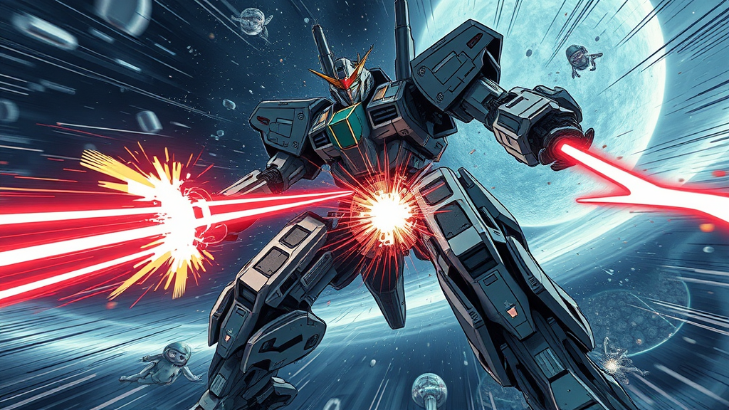 Giant mech in the vastness of space, wielding energy swords, inspired by Tsutomu Nihei's distinct style, reminiscent of Sidonia no Kishi. Emphasizing anime elements, showcasing extreme gigantism, set in a futuristic environment. High-intensity sci-fi scene, capturing motion and combat, with hyper-detailed visuals. Laser bursts illuminate the void, surrounded by swirling energy clots. Depicts swift acceleration and intense light flashes, conveying immense speed. Rendered in a detailed, manga-inspired drawing style, offering a first-person perspective in stunning 8K and HD super-resolution.