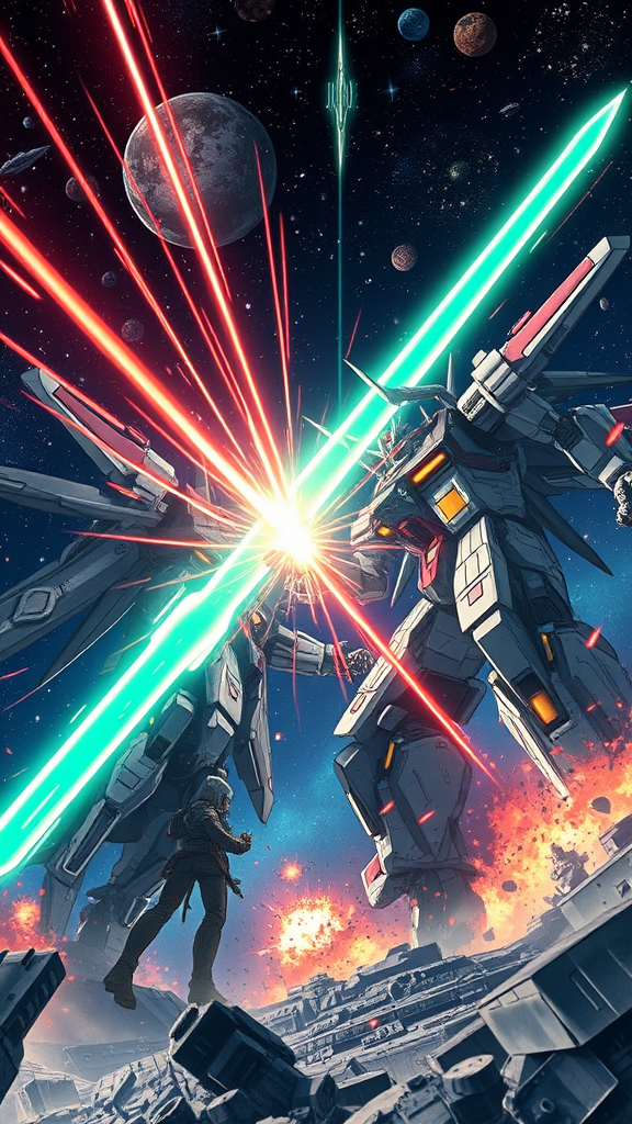 Giant mech warriors clashing in the vastness of space, wielding massive swords in a dynamic duel, reminiscent of Tsutomu Nihei's distinct artistry in Sidonia no Kishi. The scene captures the essence of anime with towering figures, encapsulating gigantism in a futuristic, sci-fi setting. Detailed imagery highlights the mechs in motion with beams of light slicing through the darkness, accompanied by bursts of energy and swift accelerations. The environment is a visual spectacle with hyper-detailed manga graphics, capturing blinding flashes and the sheer velocity of combat. The visual narrative is rendered in high-definition, conveying the immense scale and tension of the battle in 8K super-resolution, as viewed from a first-person perspective.