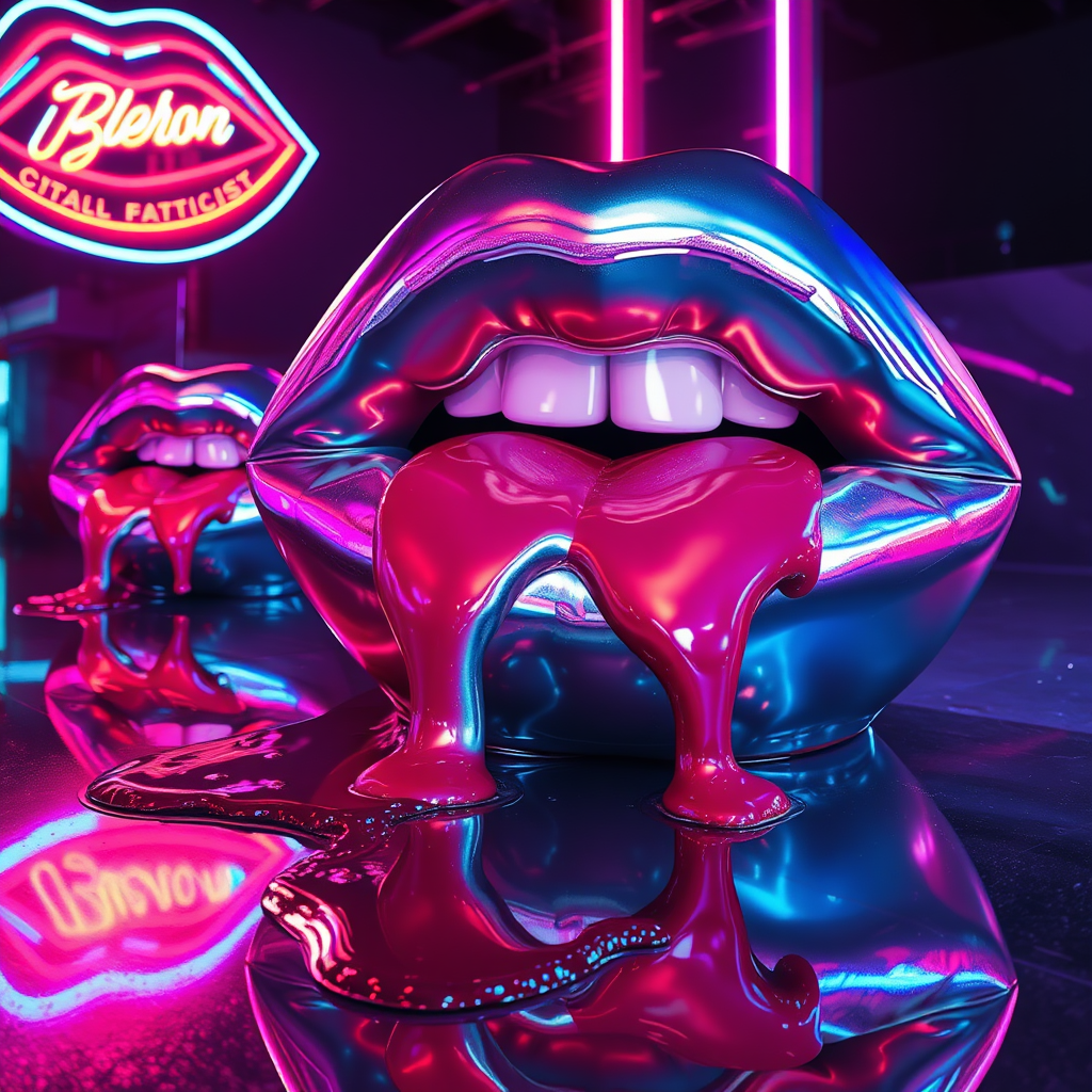 Giant metallic lips with glossy lipstick dripping onto the floor, surrounded by neon lights casting colorful reflections on the liquid puddles, creating a vivid and surreal atmosphere.