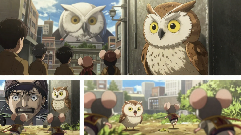 I want to edit the first picture. On the first picture there are two frames from Attack on Titan anime - on the top frame a the first Titan infiltrated the city (in the background, we only see its giant head) as horrified and frozen people are looking at him, on the bottom one - Titan looks directly at people, and they start to run On the second and third you can see a small horned owl owl chick. On fourth and fifth picture you can see chibi mice heroes - mice girls wearing adventurers outfits Now, i want to make a picture: Replace titan with this owl chick (so a giant white owl head (with the same lighting) is first just over the building on the first frame, and then - turns to see its prey. Owl looks cute, but the scene itself is horrifying. Replace people with three mice from images 4-5. On first it would be rear view of three mice citizens looking up at owl chick. On second - they are running towards us in fear as small happy owl looks at them with hungry look. So, two frames - on first a small owl chick, disheveled and hungry is standing behind building, looking away, as mice citizens look up at her. On second, she snaps and looks at them with hungry look (use the overall disheveled look of owl chick from image 2) as mice start running towards viewer (utilize foreshortening here, they are now vey close, and blurry, and they should be the same three mice as on previous frame) We don't see owl body for the most part, for she is standing behind building, we only see her head. On first frame - owl doesn't look at us, she just looks away. On second - she looks towards us. Try to retain lighting of the image 1 3:4 ratio, use background and buildings and people location from image 1