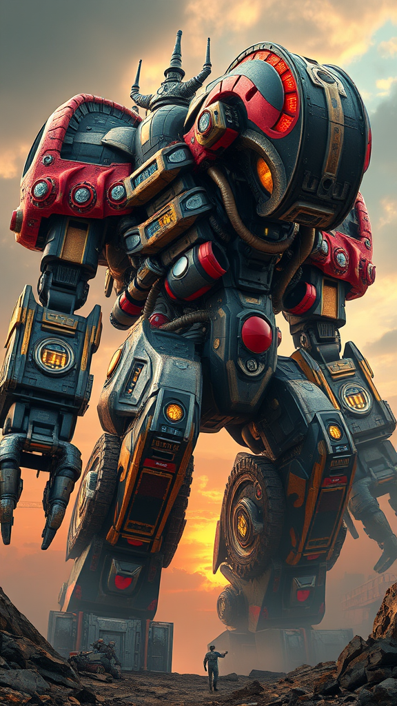 giant robot in photorealistic style with vibrant and intricate details, inspired by Frank Frazetta, featuring complex 3D rendering, ultra-detailed design, highly cinematic, incorporating the detailed style of Daz 3D, in stunning 4k resolution, showcasing powerful presence amidst a dynamic and dramatic backdrop.