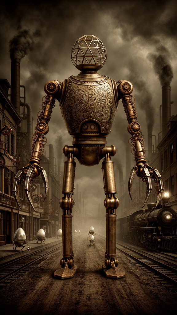 A colossal steampunk robot with a geometric dome head and ornate paisley torso stands on a dirt road in a bustling industrial city. Smoke billows from factory chimneys under a dark, stormy sky, creating a dramatic, sepia-toned atmosphere.