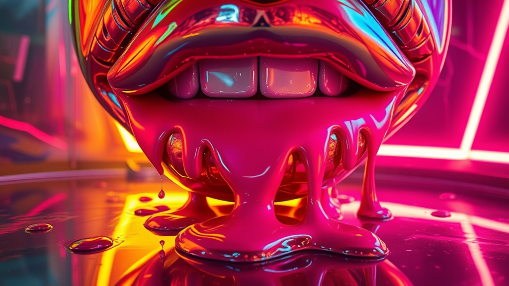 Gigantic metallic lips oozing vibrant lipstick, droplets cascading to the floor in glistening rivulets amidst a glowing neon backdrop, where liquid reflections shimmer and the metallic sheen contrasts sharply with the vivid colors.