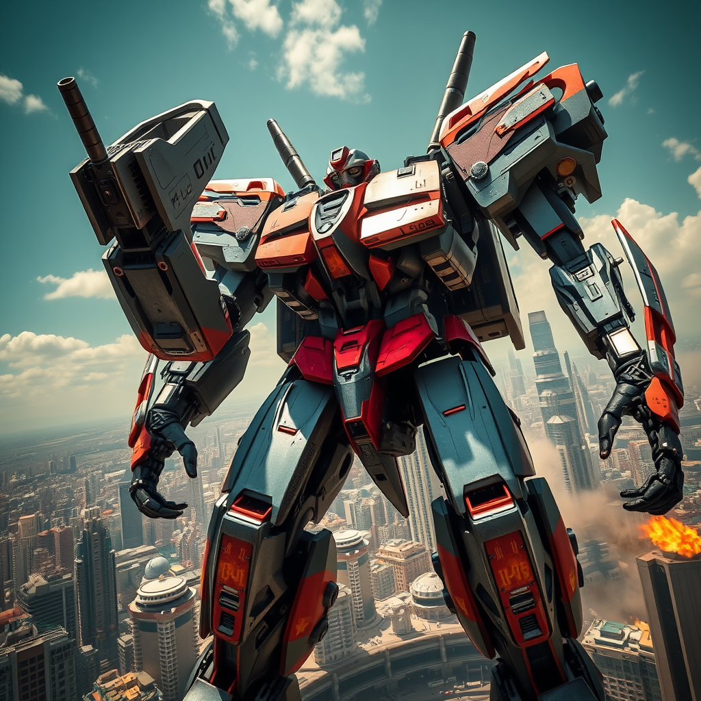 Gigantic robotic warrior, detailed and lifelike, shot with a DSLR camera, wide-angle perspective, towering over a futuristic cityscape, dynamic pose, vibrant metallic colors, intricate mechanical joints, gleaming under the sunlight, captured amidst an epic battle scene.