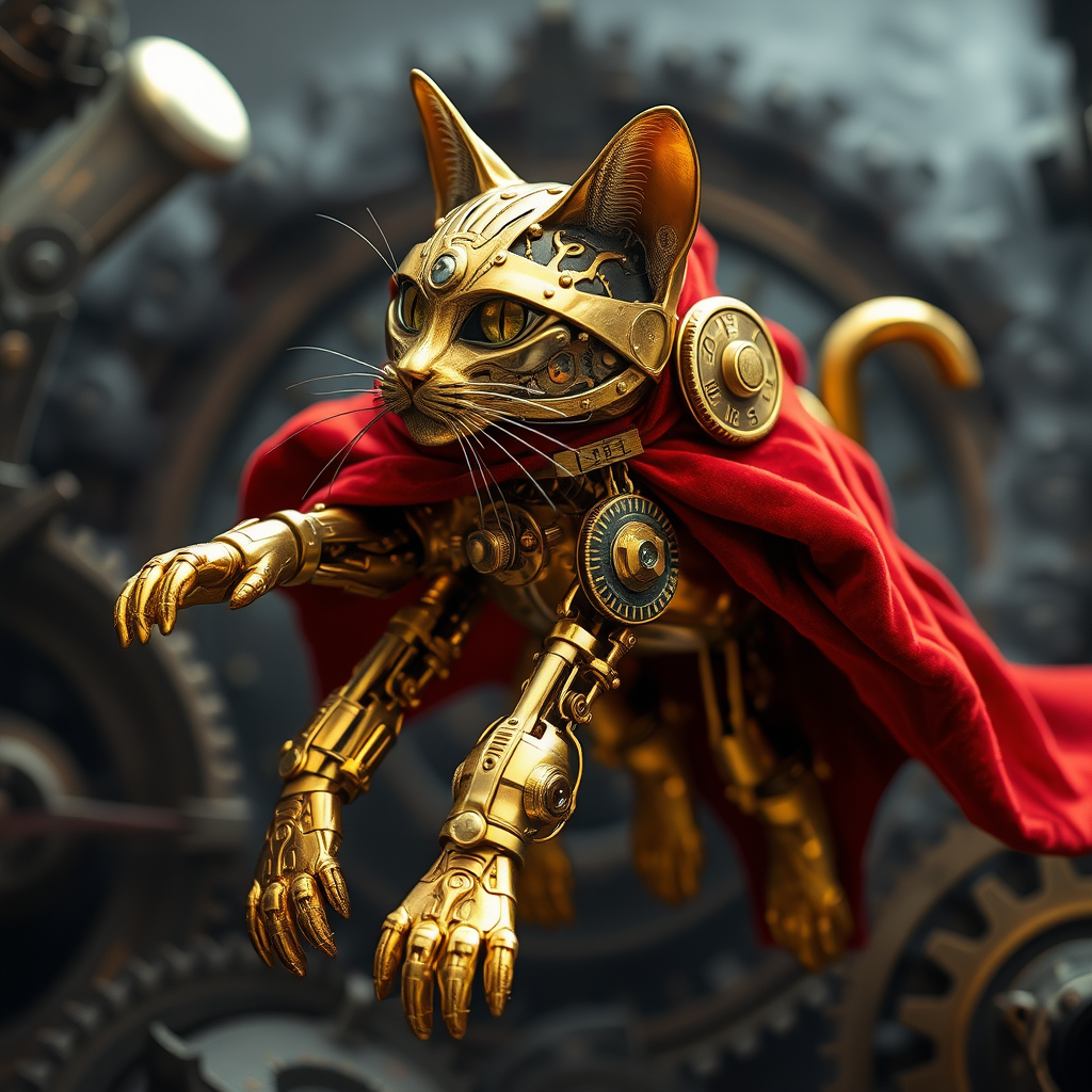gilded steam-powered feline sultaness rendered in hyper-realistic octane, intricate brass clockwork limbs and flowing crimson velvet cloak suspended in mid-air amidst a macro lens-refracted atmosphere of oil smoke and rusting gears, -ar 2:5 -q 1.5 -v 5.
