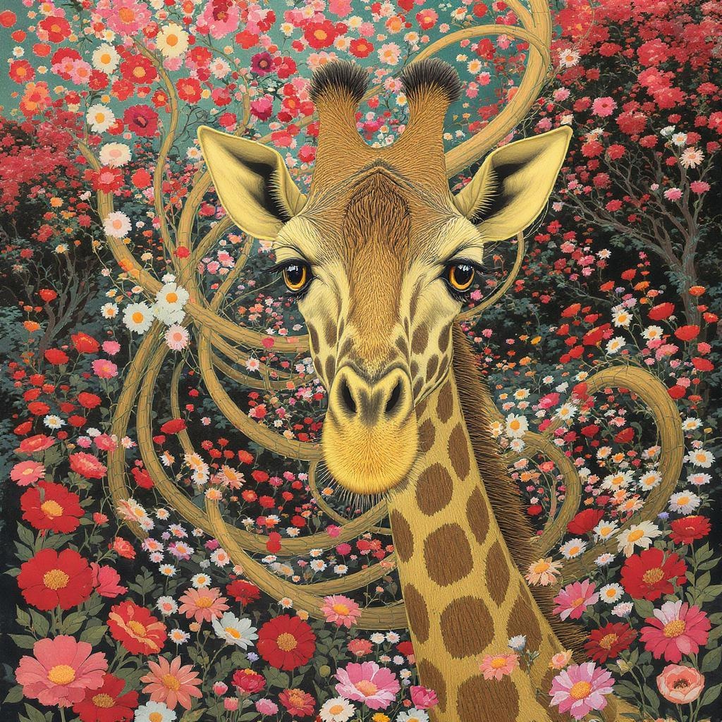 Giraffe entwined in a lush garden of vibrant flowers by artist inspired by Arne Thun, in the expressive style of Natalia Rak, captured in stunning 8k resolution. Embrace vintage aesthetics with a touch of whimsical charm, perfect for wallpaper designs. The giraffe's gentle eyes and intricate floral patterns evoke the captivating surrealism of Naoto Hattori, achieving a highly realistic yet fantastical scene, fine-tuned for animated gifs, with a vertical aspect ratio of 43:64.