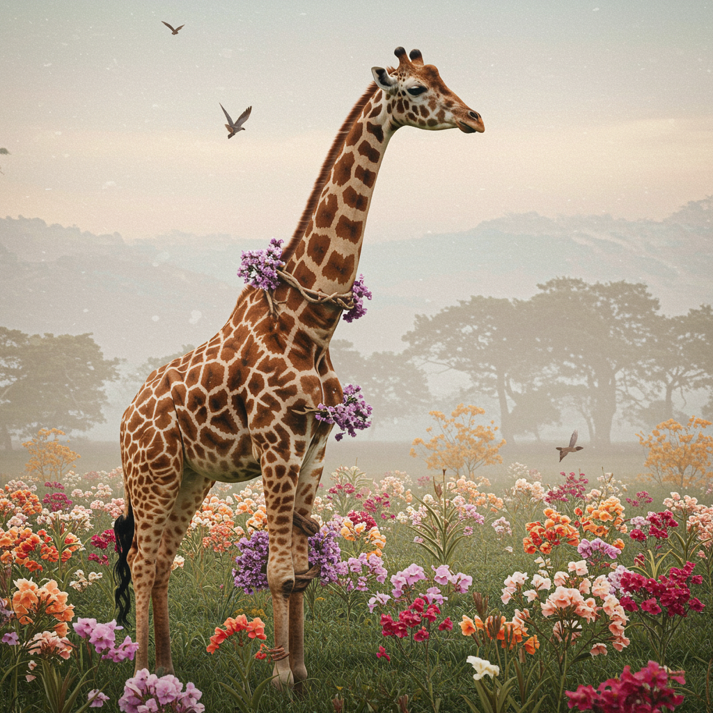 View this AI-generated image featuring giraffe gracefully entwined amidst vibrant blooms inspired by arne thun with a touch of natalia rak s style a harmonious blend of vintage aesthetics meets the dreamlike realism akin to naoto hattori captured in 8k resolution seamlessly looping animated gif elem