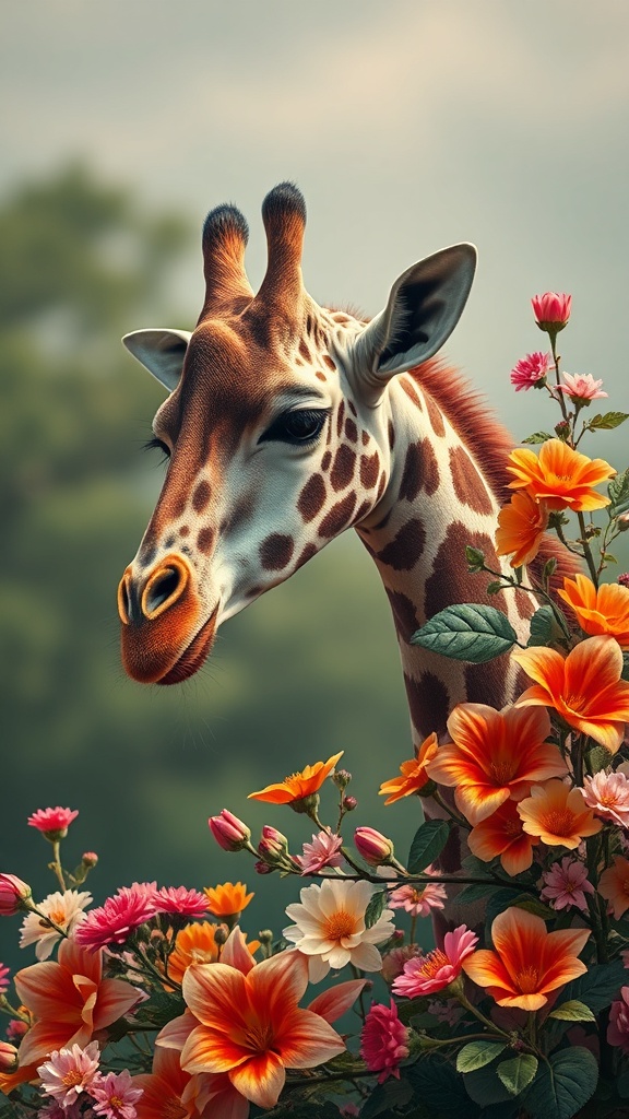 Giraffe gracefully entwined with vibrant flowers reminiscent of Arne Thun's artistry, captured in a style inspired by Natalia Rak, with a vintage aesthetic. The scene showcases highly realistic details akin to Naoto Hattori's work, presented in stunning 8k resolution for a wallpaper setting. The composition is animated, featuring subtle movements that bring life to the serene portrait. Aspect ratio is elongated at 43:64, enhancing the towering elegance of the giraffe amidst the floral tapestry.