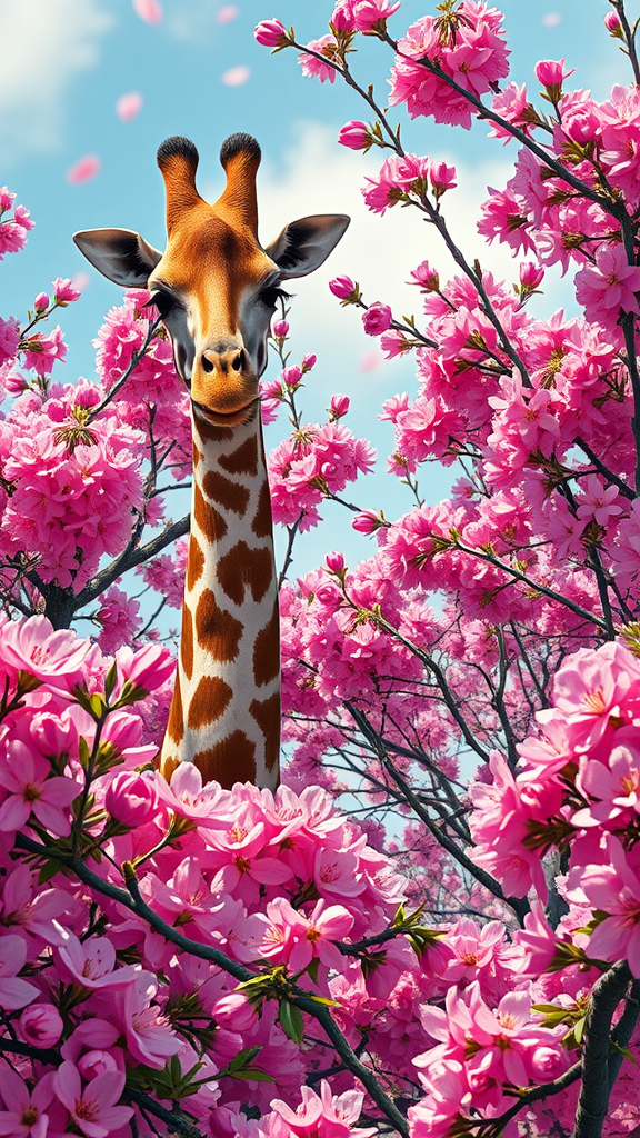 Giraffe nestled among vibrant blossoms, inspired by artist Arne Thun, rendered in the vivid style of Natalia Rak. Featuring vintage aesthetics in 8k resolution, the scene comes alive with animated elements, echoing Naoto Hattori's highly realistic touch, creating an enchanting living wallpaper with a unique aspect ratio of 43:64.