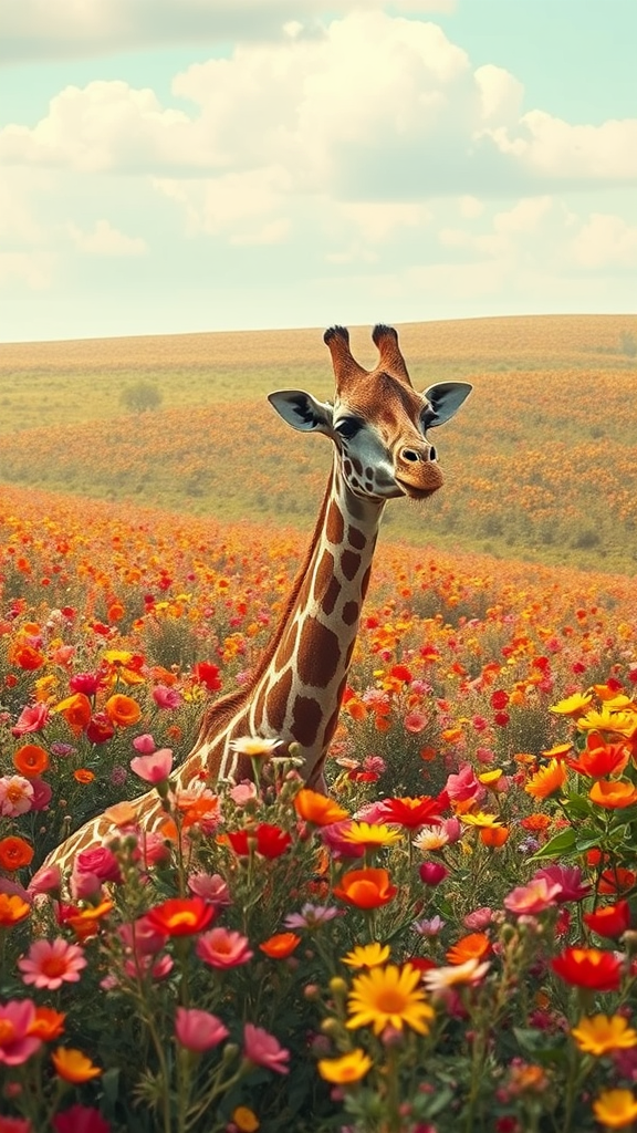 Giraffe surrounded by a lush field of vibrant flowers, infused with the artistic essence of Arne Thun, blended with the captivating style of Natalia Rak, rendered in 8k resolution. The scene captures a vintage aesthetic with a touch of whimsical charm, reminiscent of an elegant wallpaper design. Animated elements bring subtle life to the composition, drawing inspiration from Naoto Hattori’s highly realistic approach. The setting evokes a dreamlike serenity, stretching out in a 43:64 aspect ratio.