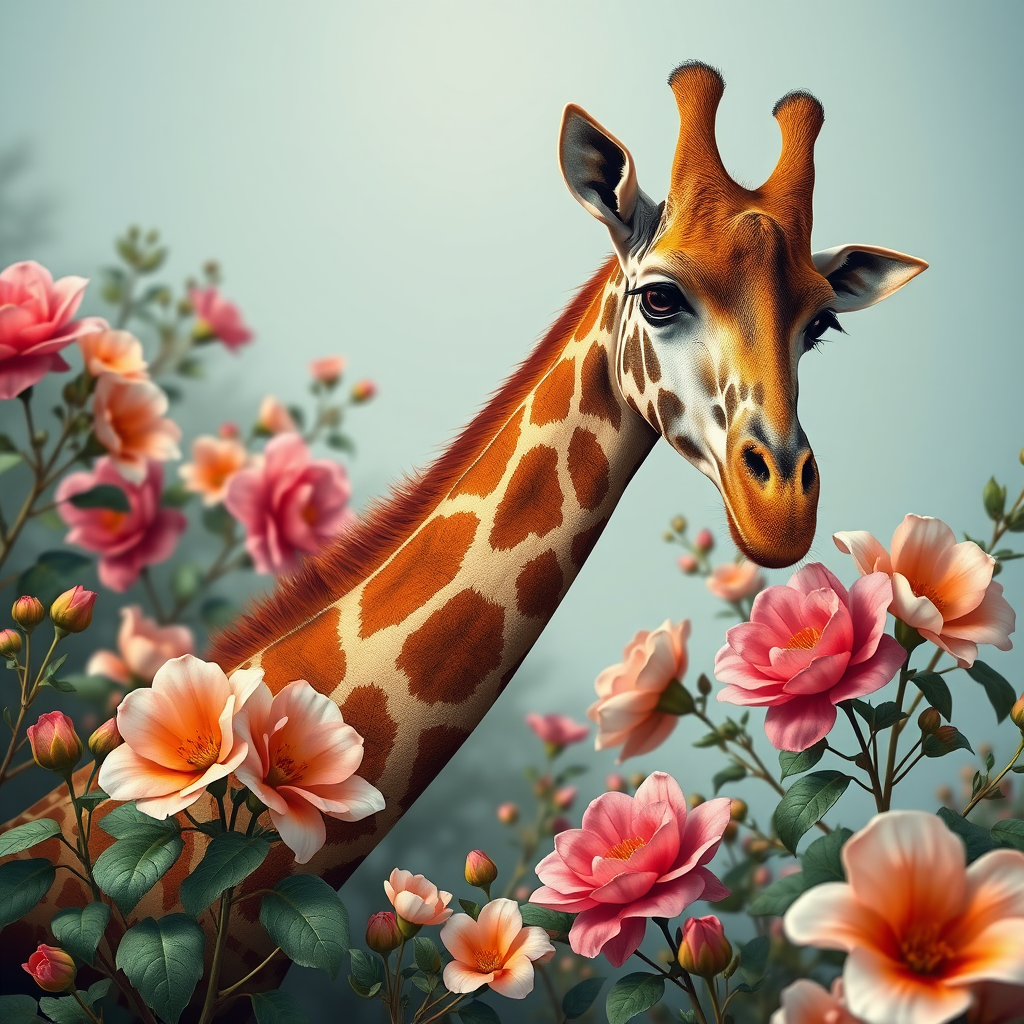 giraffe surrounded by blooming flowers by artist arne thun, rendered in the style of natalia rak, ultra high-definition, with a touch of vintage aesthetics, designed as wallpaper with subtle animated elements, inspired by naoto hattori, with a focus on stunning realism and intricate details, aspect ratio 43:64, version 6.0