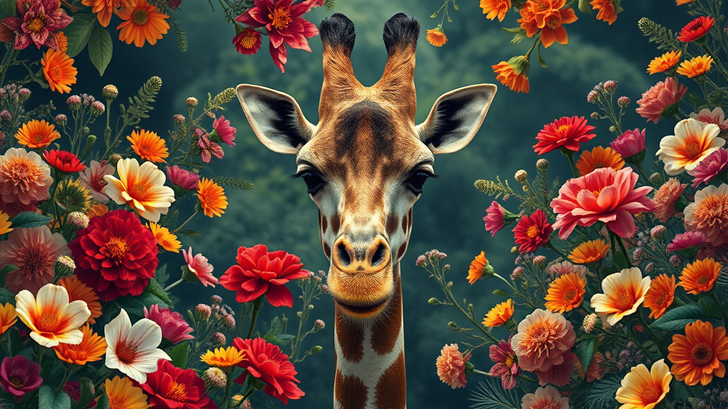 Giraffe surrounded by vibrant flowers inspired by Arne Thun, crafted in the captivating style of Natalia Rak, featuring vintage aesthetics with an 8k resolution for a wallpaper setting. Incorporating elements of animated gifs and the surreal touch of Naoto Hattori, the scene is highly realistic, capturing the majestic grace of the giraffe amidst a lush floral backdrop, with a unique aspect ratio of 43:64, invoking a sense of timeless wonder.