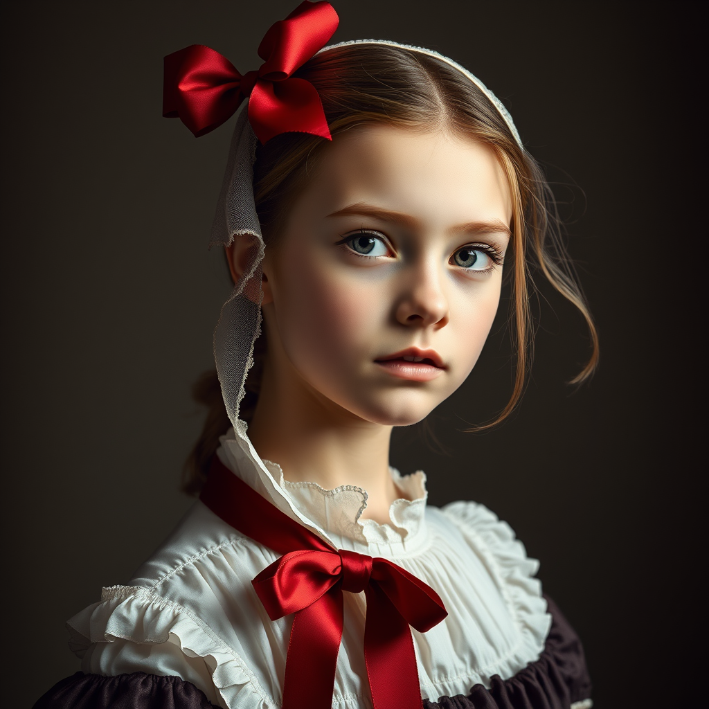 Girl adorned with a crimson ribbon, perfect symmetry, illuminated by soft studio lighting, reminiscent of Dutch Golden Age artistry by Johannes Vermeer, with subtle modern touches.