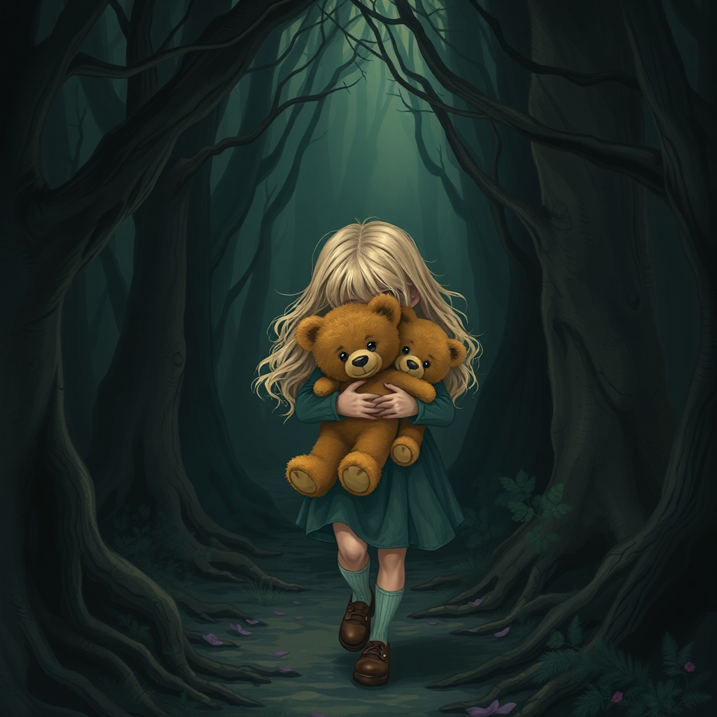 View this AI-generated image featuring a young girl with cascading blonde hair steps cautiously into a shadowy forest pulsing with mysterious dark magic clutching two well loved teddy bears tightly to her chest their button eyes gleaming faintly in the dim light filtering through the twisted branche