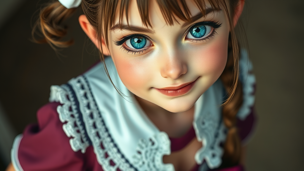 girl, bust up view, 1girl, close-up, portrait, turquoise eyes, sly smile, looking at viewer, dynamic pose, elaborate school uniform, excessive lace, low-res, washed out, artefacts, partial victories, illegible signature, transparent watermark, clashing gradients, mutilated body proportions, disarming glance, exposed navel, heavy breasts, soft lighting, shimmering sparkle, youthful appearance, rare birthmarks, perfectly spanned glide, disconnections, bulging caricature limbs, overlaid scratches, dancing track lines, residues of engine RMS.