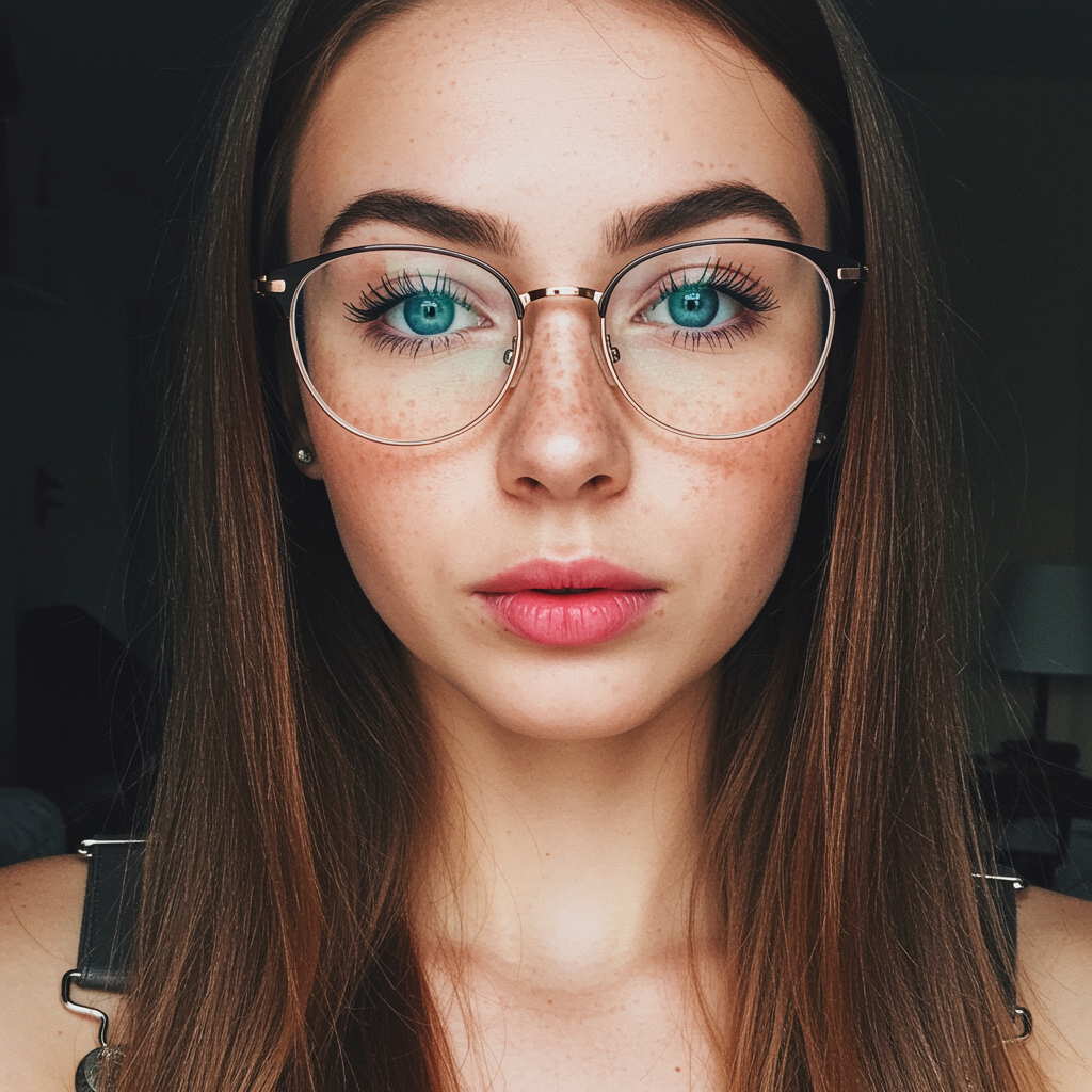 A stunning girl captures a selfie in portrait mode showcasing her mesmerizing dark blue eyes and straight brown hair. Her stylish glasses sit elegantly on her nose, while pink lipstick softens her chapped lips, complementing her freckled complexion. Her perfectly thin nose enhances her face, and she's adorned in trendy leather overalls. It's early morning, and the crisp light highlights the sharp focus on her captivating eyes. Small creative twists add a unique edge, maintaining the essence of her beauty.