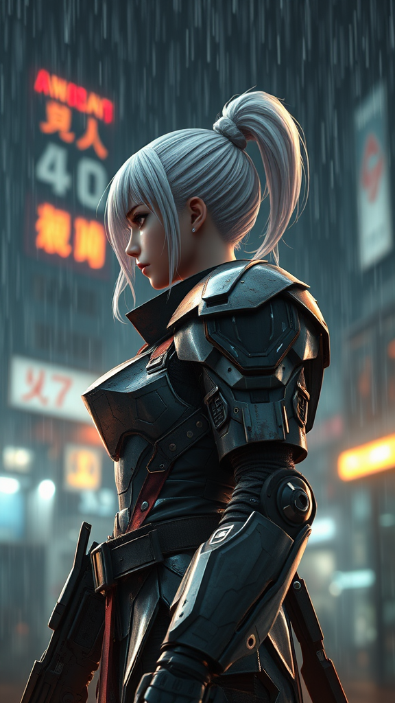 Girl clad in battle-worn Gundam armor, her white hair tied in a ponytail, standing amidst a dark, rainy night. An epic fight scene unfolds, her armor showing signs of a fierce battle. The scene captures a Borderlands style with extreme details, creating a cinematic and masterpiece-quality artwork. The environment is stunning, with a shiny and smooth surreal quality. The atmosphere is divine and celestial, drawing inspiration from manga and anime. Details are intricate and full of color, with cinematic lighting enhancing the hyperrealistic focus. The scene is crafted with the power of Unreal Engine 5, using lumen reflections and CGI. The 3D render is enhanced with Octane, ensuring high quality. However, this artistic vision avoids low quality elements like text errors, cropped images, or poorly drawn anatomy. It presents a captivating and proportionate depiction of a warrior, devoid of unnecessary duplications or deformities.