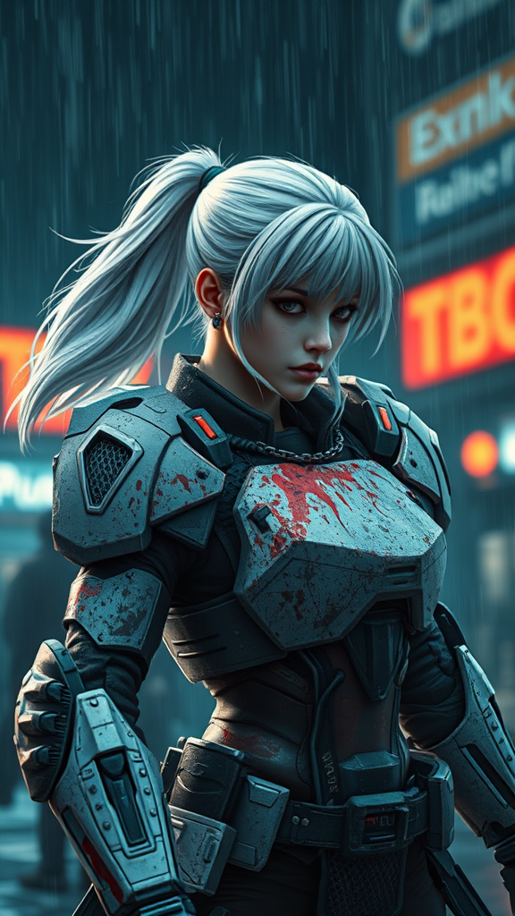 Girl clad in battle-worn Gundam-inspired armor, showcasing signs of epic combat, her white hair tied in a ponytail flowing in the dark, rainy night. Engaged in a breathtaking fight scene, she's visibly wounded yet resilient. The artwork is a stunning masterpiece, reminiscent of a Borderlands style, trending on art platforms, brimming with extreme detail and cinematic allure. The environment is surreal and divine, filled with vibrant colors under dramatic lighting, creating a hyperrealistic atmosphere. Rendered with Unreal Engine 5, featuring Lumen reflections for a striking visual, this scene is a 3D marvel. Despite low-resolution challenges and potential rendering errors, the portrayal maintains its intricate and captivating essence, with careful attention to anatomy and proportions, avoiding duplication or distortion, resulting in a visually stunning and immersive experience.