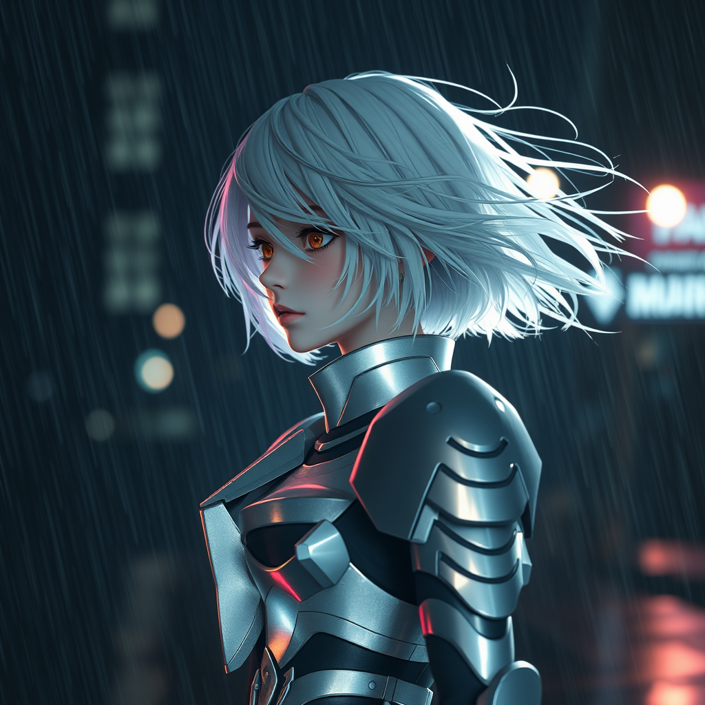 girl clad in gundam-inspired armor, her short, white hair caught in the wind on a dark and rainy night, she stands solitary, trending on artstation, infused with extreme details, cinematic quality, a true masterpiece, photography capturing a stunning environment, shining and smooth yet surreal, possessing a divine and celestial aura, rich in manga and anime influence, atmospheric with lens flares, glowing colors, detailed and intricate composition, cinematic lighting, 4k resolution, hyperrealistic focus, unreal engine 5 precision, cinematic artistry, masterful use of lumen reflections, hyperrealistic CGI, 3D design akin to a doll, rendered with octane, avoiding low quality, text errors, and imperfections, free from distortions, with anatomically accurate proportions and features.