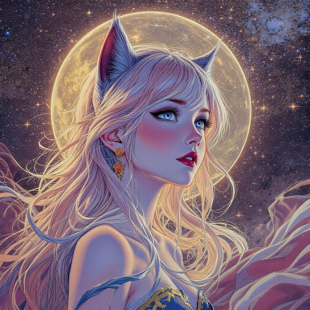 A captivating girl with feline ears gazing into the night, surrounded by an ethereal glow. The image is centered, showcasing a key visual with intricate and highly detailed features. Her breathtaking beauty is emphasized through precise lineart, enriched by vibrant colors and a comprehensive cinematic style. Inspired by the works of Carne Griffiths and Conrad Roset, the artwork presents in 8k high resolution, offering the best quality with visually stunning elements. Despite challenges such as text errors, missing or extra digits, and cropped features, the focus remains on her delicate expression and the enchanting atmosphere around her, avoiding imperfections like watermarks, poor anatomy, and distracting elements.