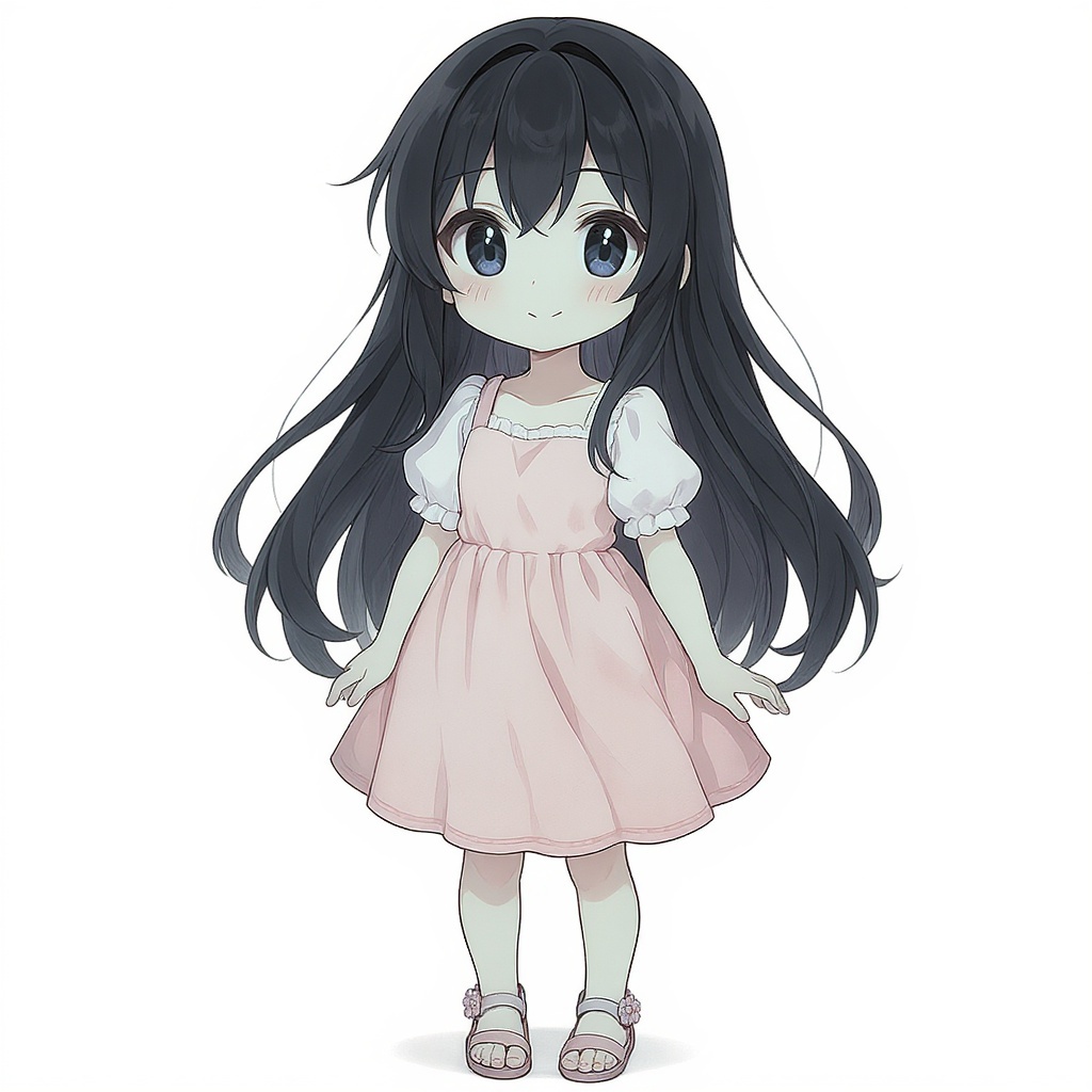 A charming girl with large, expressive anime-style eyes and silky, raven hair, dressed in a pastel pink sundress that accentuates her playful aura, paired with delicate, floral-embellished sandals.