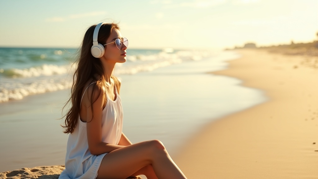 A serene and gentle girl with long, flowing hair, wearing glasses, sits quietly on a sunlit beach. Her eyes are closed as she enjoys the soothing melodies through her headphones. Her posture is relaxed, embodying tranquility. She has angelic features with perfect symmetry and a gentle smile gracing her lips. The scene is captured in a reverse shot, highlighting her graceful presence against the vast shoreline. The full-body portrait encapsulates the intricate details of her attire and surroundings, bathed in natural lighting that enhances the glowing colors and rich textures of her environment. The expansive landscape and wide angle provide a breathtaking depth of field, capturing the scene with hyper-realistic details and highest quality resolution through advanced lighting effects, offering a sense of vastness and peace.