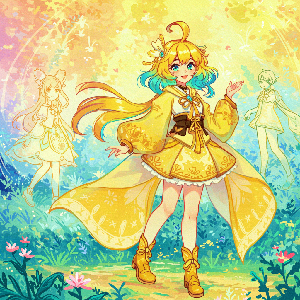 View this AI-generated image featuring a vibrant girl with kaleidoscopic hair stands gracefully within an enchanting painting inspired by the art style of yanjun cheng her appearance captures the essence of charming anime characters and fantasy artistry with a harmonious blend of yellow and cyan hue