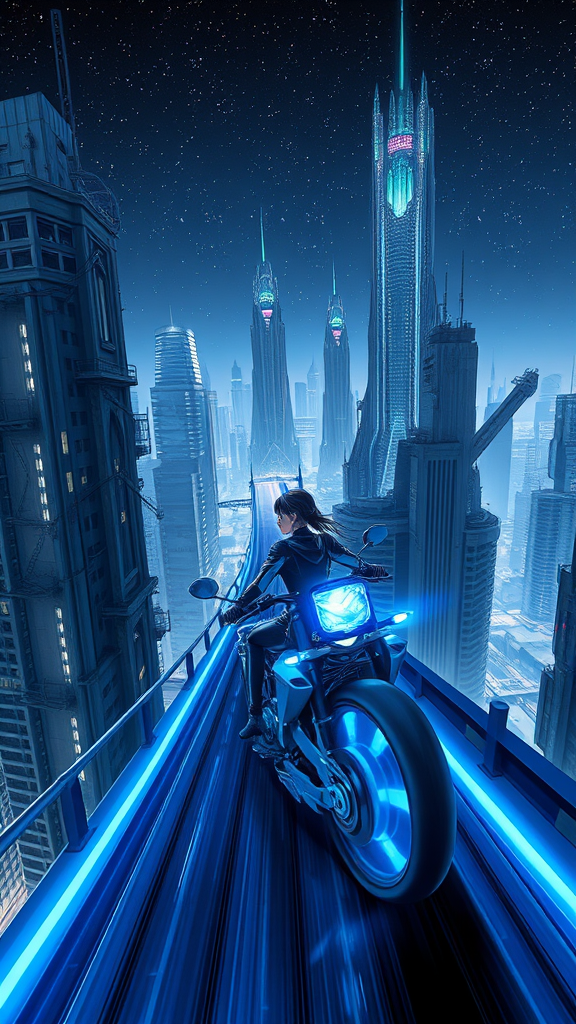 Girl in a form-fitting futuristic suit riding a sleek, neon-illuminated motorcycle on a towering bridge amidst a dystopian sci-fi city dominated by crumbling skyscrapers. The scene is immersed in a Tsutomu Nihei-inspired ambiance reminiscent of Akira, exuding a sense of gigantism and elaborate, multistory architecture. The futuristic environment is brought to life with neon blue accents, casting vibrant glows against a starry night sky. The girl's motorcycle leaves behind trails of luminous blue energy, adding to the high-tech vibe. The composition is reflected in manga-style graphics, marked by dark exposure and detailed anime artistry, rendered in stunning 8K Full-HD. The perspective is first-person, capturing the adrenaline of the ride through immersive visuals dominated by blue tones and a rich, plasma-like luminescence.