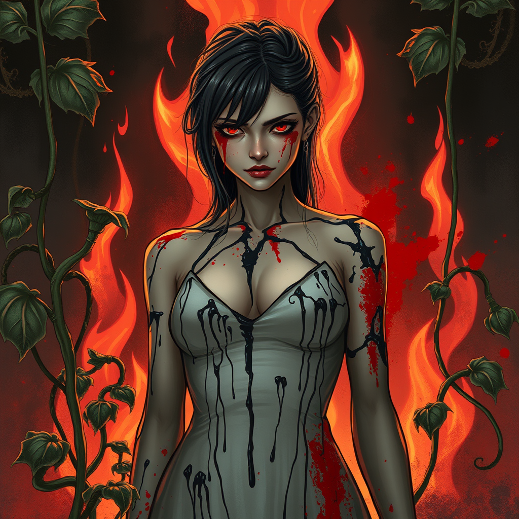 Girl in a high-cut dress with black veins and oil dripping down, surrounded by predatory plants and ivy, her face set in a gloomy expression. Red splashes and smudges accentuate the scene against a backdrop of fire. Captured in an illustration with fine art quality, the image utilizes 8K resolution for intricate detail. Rim and artificial lighting create a cinematic atmosphere, highlighting the contrast and tension within the artwork, with the composition arranged in a 1:2 aspect ratio.