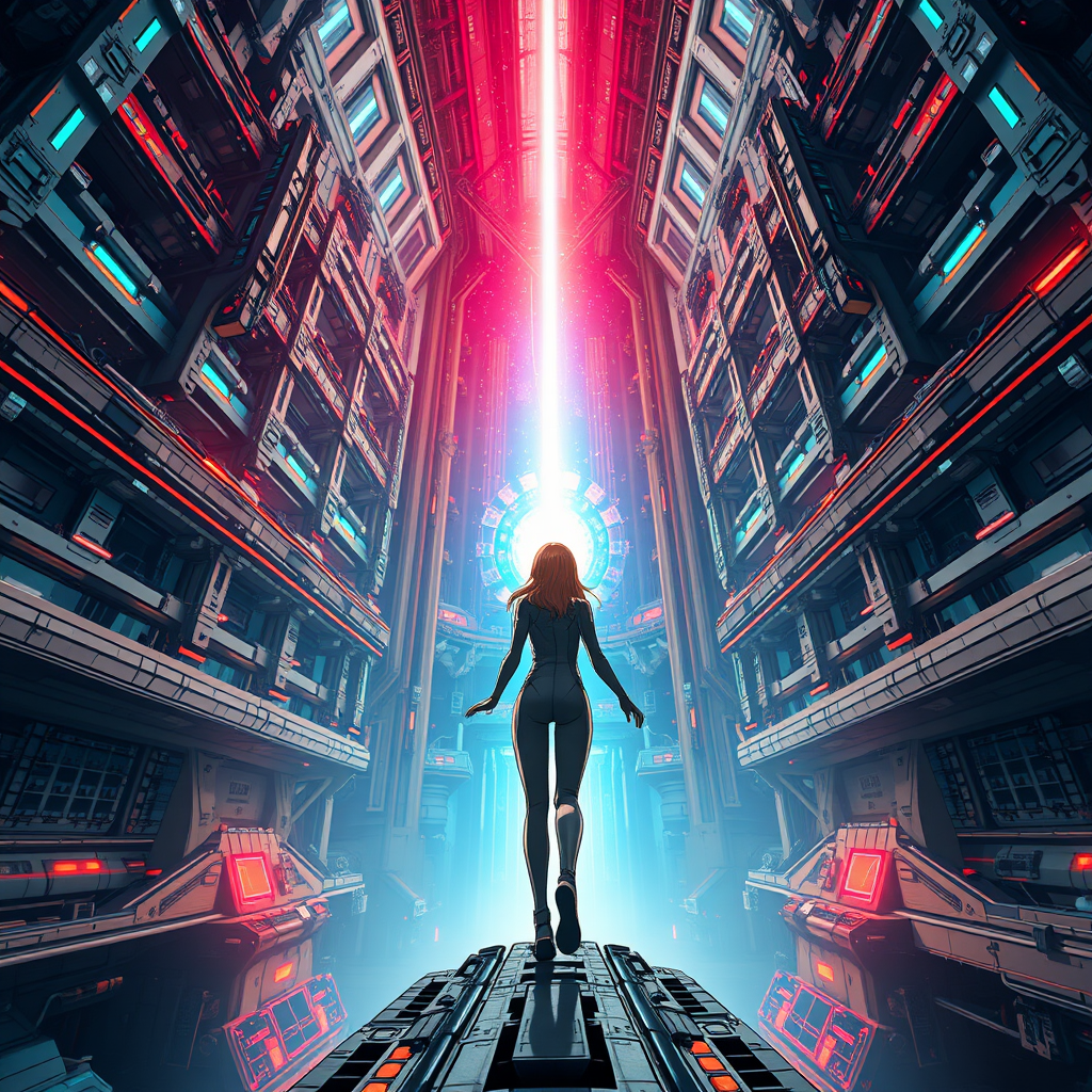 Girl in a sleek, form-fitting jumpsuit navigating the cavernous interior of a massive spaceship, inspired by Tsutomu Nihei's distinct style from Sidonia no Kishi. The environment showcases a multi-level space filled with colossal structures and intricate details, emphasizing the scale of gigantism. At the core, a powerful laser generator emits a vibrant beam that pierces through the layers, creating a dazzling spectacle. Energy clots swirl around the beam, enhancing the sense of acceleration and speed. The scene captures the essence of futuristic sci-fi, rendered with hyper-detail and anime-inspired graphics, achieving an ultra-HD, 8K super-resolution akin to manga art. The perspective is immersive, providing a first-person view, amplifying the sense of being within this fast-paced, light-flashing universe.
