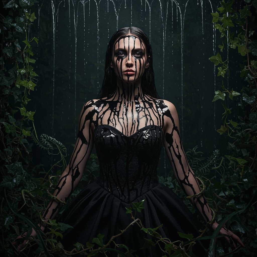 Girl in an elegant high-cut dress with intricate, black vein-like patterns weaving across her skin, as if dripping with oil. Predatory plants entwine around her, interspersed with dense ivy, creating a dark, atmospheric setting. Her face, a portrait of serene gloom, is touched by splashes and smudges of deep red, adding an unsettling contrast. The background is a cascade of dripping oil, enhancing the moody ambiance. This fine art illustration is captured in ultra-high definition, utilizing a blend of rim and artificial lighting to create a dramatic, cinematic effect.
