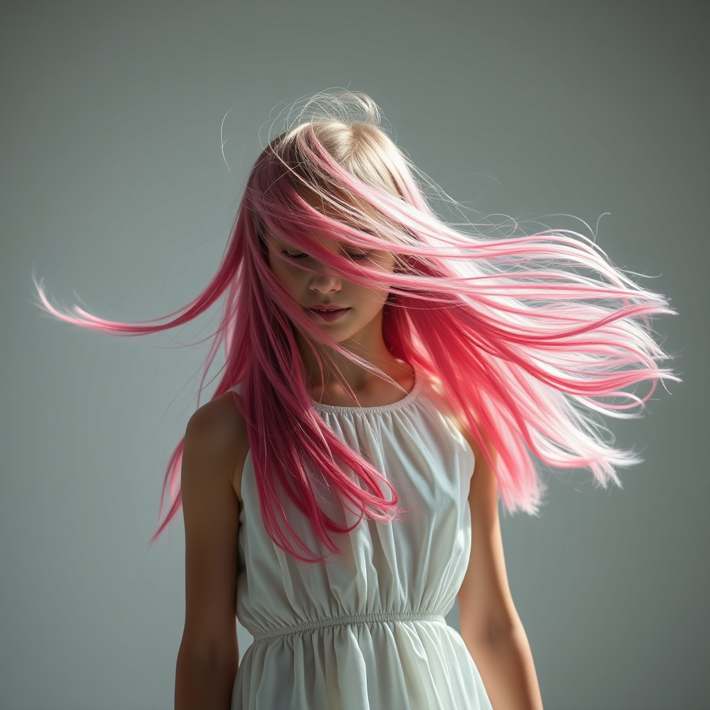 Girl in flowing light dress with strong wind blowing through long pink hair 80mm lens capturing soft light sharp details and exposure blend medium shot with bokeh effect high contrast low saturation model shoot style featuring dramatic lighting and minimalistic composition with flat and washed colors incorporating subtle dithering effect line art elements symmetrical framing using octane render with 35mm lens in a 9:16 aspect ratio enhanced by HDR for depth and richness.