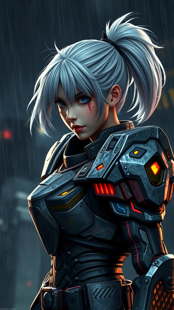 Girl in Gundam-inspired armor, battle-worn and scarred, with white hair styled in a ponytail, set against a dark, rainy night. Engaged in an epic fight scene, she looks fierce yet wounded. The atmosphere is reminiscent of the Borderlands art style, capturing trending work seen on ArtStation. The scene is cinematic, defined by stunning details and a compelling, smooth environment. The setting feels surreal and almost divine, with celestial undertones, blending elements from manga and anime. The lighting emphasizes intricate, colorful details, making it hyperrealistic and brilliantly focused. Rendered in an Unreal Engine 5-like environment, the visuals are enhanced by Lumen reflections and Octane-like render quality. Despite the high-detail focus, it's important to avoid qualities like text errors, low resolution, and any indicators of low quality or distortions, ensuring a masterpiece that fully encapsulates the essence of epic, cinematic art while steering clear of errors in anatomy and style.