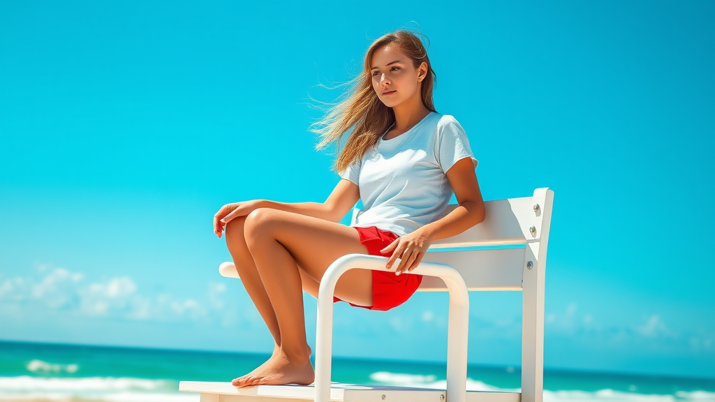 Girl lifeguard on duty, wearing a simple white t-shirt and bright red shorts, sitting comfortably on a sunlit white lifeguard tower. The scene is captured in stunning detail, professionally color graded with a refined depth of field. Her gaze surveys the beach with a sense of calm vigilance, while the ocean breeze gently tousles her hair. The vivid blue sky and the soft roar of the waves in the distance create a serene backdrop, enhancing the overall atmosphere of a sunny, summer day by the sea.