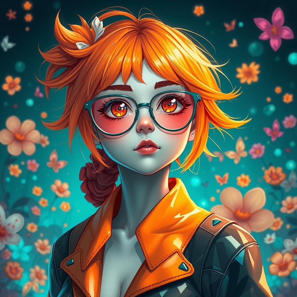 A captivating girl with vibrant orange hair and sleek glasses, depicted in a futuristic digital art style with flowerpunk influences. Her attire reflects a glossy and shiny finish, blending harmoniously with a dark teal and orange color palette. The scene bursts with lively colors, highlighting her charming and dynamic personality, set against a vivid backdrop teeming with imaginative and enchanting elements.