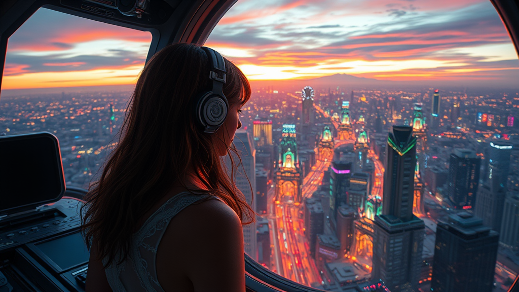 Girl peers out through the viewport of a high-tech spacecraft, suspended above a labyrinthine cyberpunk metropolis at dusk, where neons dance and bleed across the cityscape like a thousand rainbows, physics-defying lighting effects creating an ethereal glow, high-contrast, 8K wallpaper masterpiece, ultra-detailed CG rendering, a symphony of rich colors, cinematic stillness, juxtaposed against the gritty, dystopian landscape, infinite depth, robust textures, rescued fromcieaged ovirulelig.getIn a worldblack crashes.