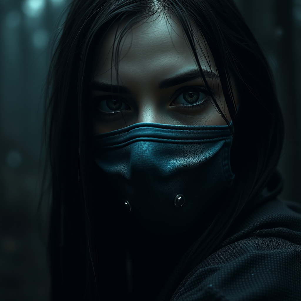 Girl portrait brunette with a mask on her face, eerie and dark, highly detailed, rendered in octane, with a wet and dense atmospheric feel, evoking an epic and dramatic mood. The scene is empty and creepy, reminiscent of trail cam footage, intensely photorealistic, with intricate and hyperornate details, captured in a style similar to Haris Nukem, adding subtle creative twists that enhance the mysterious and haunting essence.