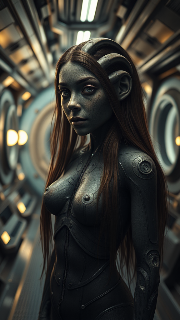 girl, Sarah Louise Kerrigan, dark corridors, futuristic spaceship tech corridor, natural chitin texture, airlock in the background, expressive background, super detail, hyperphotorealism, huge amount of fine detail, long hair, gray eyes, flickering light, 8K, UHD, super resolution, futuristic, natural textures, warm light, cinematic, flickering halogen, captivating lighting, surreal anatomy, abstract form, two faces, dual torsos, totem-like appearance, distorted visage, extra appendage, unusual formation, unique, transformed, exaggerated features, intricate hands, floating elements, ethereal limbs, enigmatic expression, impressionistic, mysterious aura, doubled features, oversized hands, intriguing light, circular windows, curved lines, misty eyes, double presence, enigmatic expression, radiant glow.