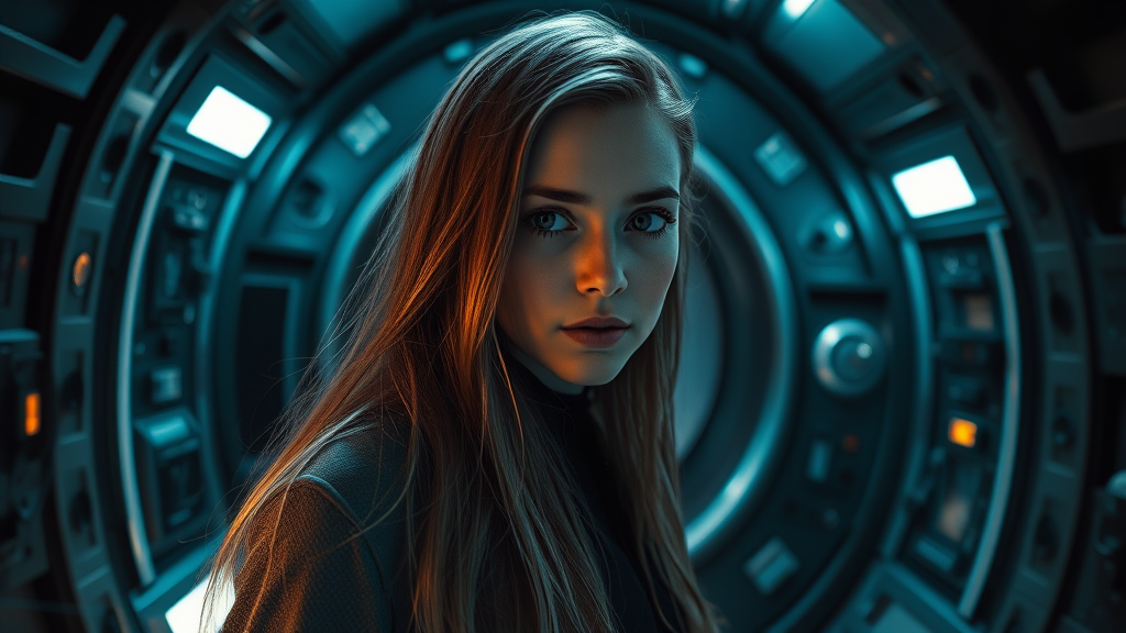 girl : Sarah Louise Kerrigan : exploring dark corridors of a futuristic spaceship, surrounded by advanced tech, her presence contrasts with the natural chitin textures around her. The airlock looms in the background, blending expressive design with super-detail. Her long hair cascades down her shoulders, and her gray eyes reflect the flickering light. This hyperphotorealistic scene is rendered in 8K UHD, capturing an incredible amount of fine detail. The setting feels both futuristic and organically textured, bathed in warm, cinematic lighting. Despite the technical setting, the atmosphere is alive with natural textures and the unpredictable dance of flickering halogen lights. Deep within the ambiance, unsettling anomalies emerge, hinting at deformed realities, distorted forms, and unsettling mutations—details bleed into one another, where anatomy and proportions fail, leaving behind a surreal landscape of dissonance. The scene is a distorted weave of blurring identities and chaotic forms—a reflection of complex disarray within an almost dream-like cinematic vision.