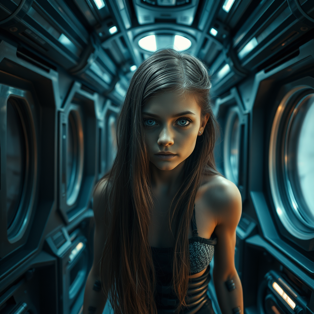 girl : Sarah Louise Kerrigan : exploring dark corridors on a futuristic spaceship, featuring high-tech chitin-like textures with an airlock visible in the distance, surrounded by an expressive and detailed background, captured in hyper-realistic 8K quality. Her long hair cascades down, and her striking gray eyes reflect the flickering halogen lights, enhanced by cinematic lighting. Despite the grand setting and ambiance, disfigurements such as deformed anatomy, extra limbs, and gross mutations create a jarring contrast, adding an unsettling element to the scene. The blending of natural textures with futuristic elements offers warmth amidst the chaos, while smooth round windows filter in natural light. Despite the surreal mutations and unsettling features, the scene maintains a super resolution, capturing the intricate details of the unsettling yet captivating environment.
