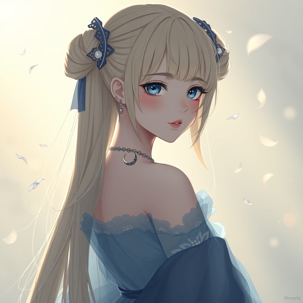 A solitary girl stands bathed in ethereal backlighting, her silhouette a vision of elegance. Her blonde hair cascades in very long twintails secured with ornate hair buns, gently adorned with delicate hair ornaments that shimmer subtly. Her bangs gently frame her face, where striking blue eyes meet the viewer's gaze with an enigmatic allure. A crescent mark graces her forehead, adding a touch of mystique, while matching facial crescents adorn her cheeks. She is clad in a soft, see-through blue dress that subtly hints at delicacy, its off-shoulder design revealing bare, graceful shoulders. A shawl drapes elegantly over her arms, mirroring the movement of floating petals that dance around her. Shimmering earrings and a delicate necklace complement her sophisticated fashion sense, reflecting the blueness of her attire. As she glances back, her parted lips softly suggest contemplation. Inspired by the timeless grace of Tsukino Usagi, she embodies a serene strength, with very long, flowing hair akin to a celestial reincarnation, captured in a timeless, close-up view.
