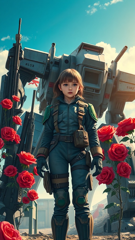 View this AI-generated image featuring a young girl stands boldly in a worn futuristic suit reminiscent of soviet and ussr poster styles surrounded by an array of guns and roses that add a striking contrast to the scene behind her a massive mech looms its intricate details visible under the bright s