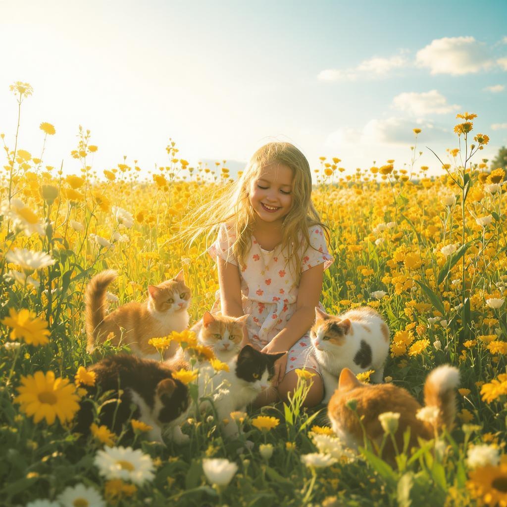 A young girl surrounded by playful cats in a sunlit meadow, each feline displaying unique colors and patterns, as the gentle breeze rustles the wildflowers around them.