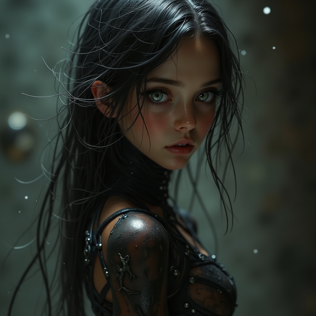 girl, texture, hyper-detail, hyper-realism, immense fine detail, flowing hair, silver-gray eyes, shimmering light, ultra-high definition, futuristic elements, organic textures, warm glow, cinematic ambiance, flickering halogen illumination, cinematic shadows, distorted anatomy, additional limbs, incomplete form, disjointed structure, anomalies, malformed features, unsettling, blurred, missing or surplus limbs, ominous beauty.